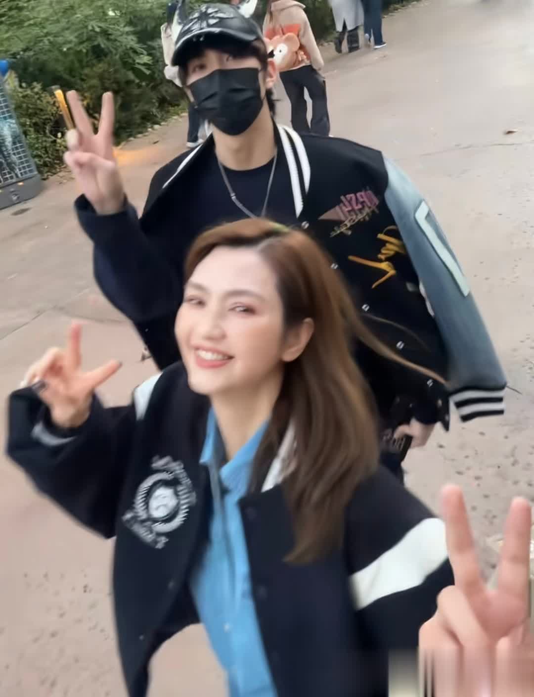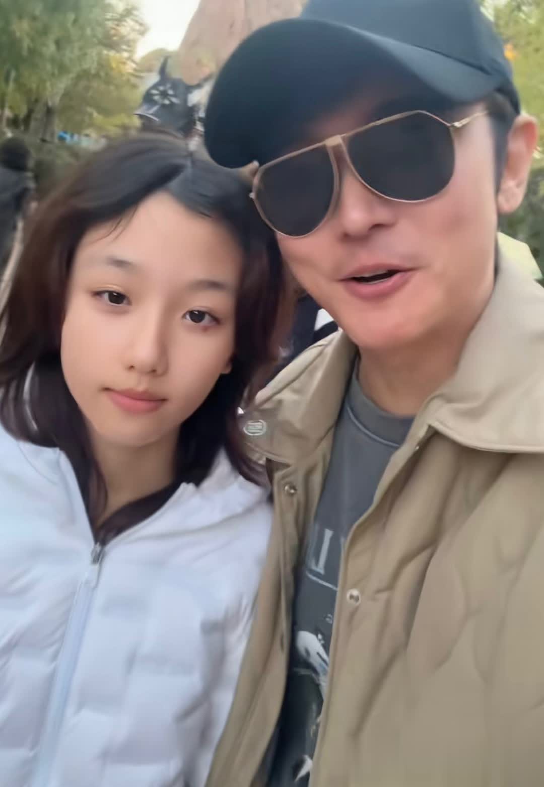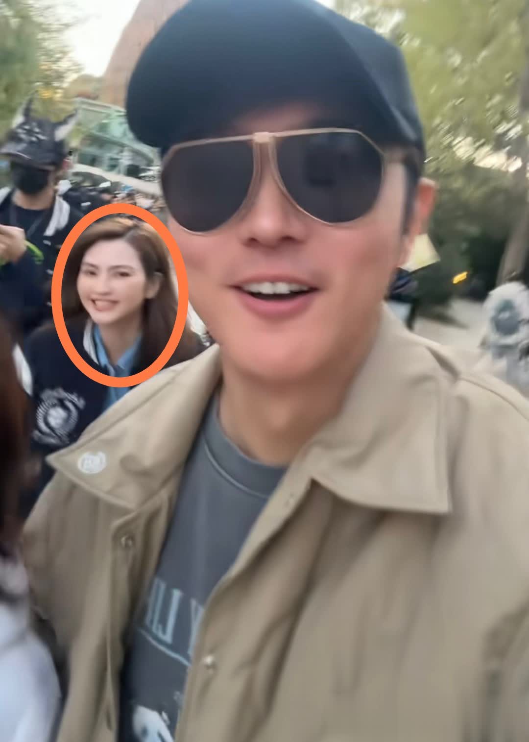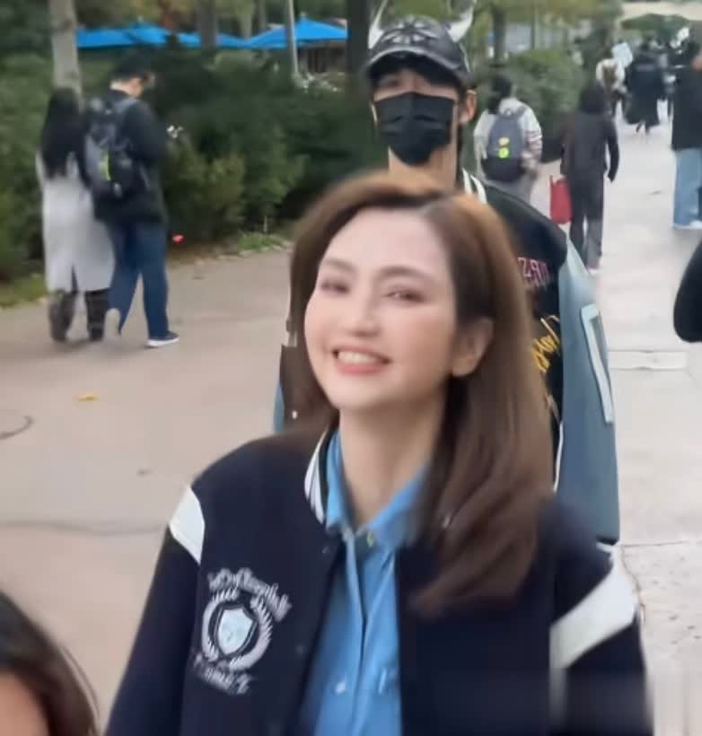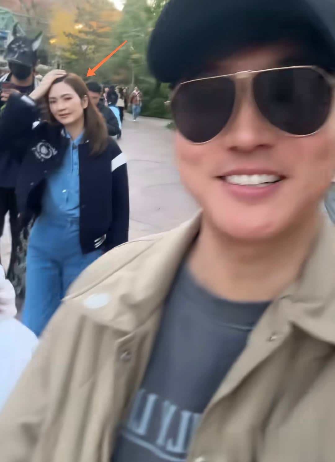 再往后镜头一歪突然看到了洪欣的身影,难怪张丹峰一路上都笑得合不拢嘴,老婆孩子都团聚了,这种整整齐齐的全家出游活动,谁都会很开心吧!洪欣也很默契往张丹峰这边看,一手还不忘整理头发,她本人皮肤特别白皙。